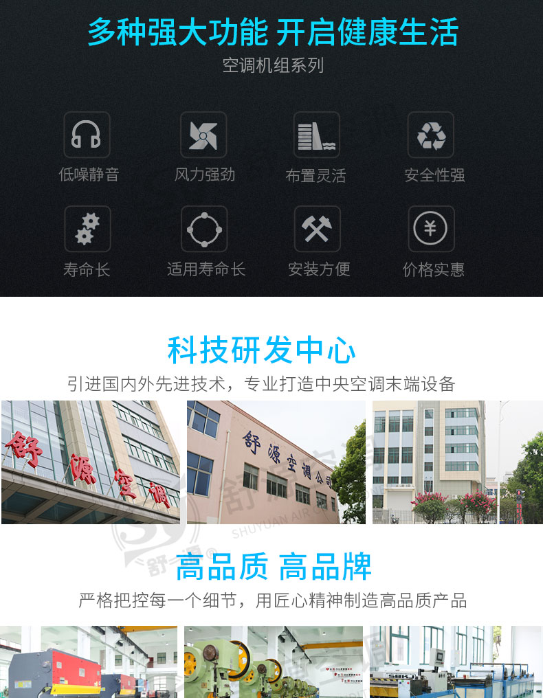 江蘇舒源空調(diào)制造有限公司生產(chǎn)“舒源”牌組合式空調(diào)機(jī)組、柜式空調(diào)機(jī)組、風(fēng)機(jī)盤管和各種規(guī)格通風(fēng)配件、自動(dòng)控制柜、空氣凈化及防火閥消聲類產(chǎn)品,亦承接空調(diào)通風(fēng)工程、凈化工程的設(shè)計(jì)、制作安裝業(yè)務(wù),并可根據(jù)用戶需要設(shè)計(jì)制造非標(biāo)產(chǎn)品。